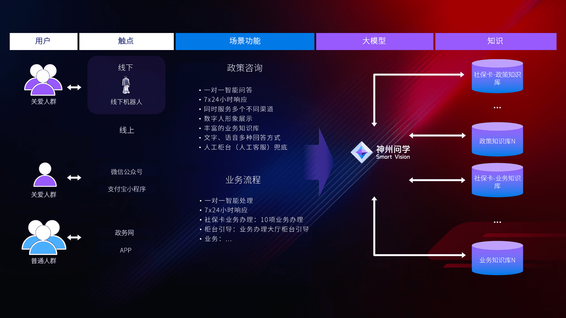 • 线上线下全覆盖:线上提供微信公众号、、、、支付宝小程序、、、、政务网、、、、app多种渠道,,,,与线下机器人形成完整服务体系。。